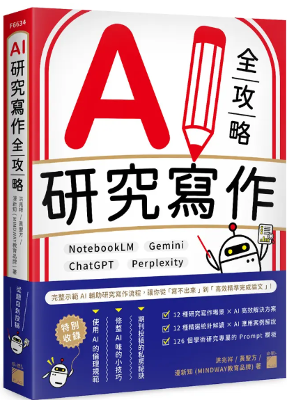 本書完整示範 AI 輔助研究與論文寫作的實戰流程,陪你度過那些「卡住、寫不下去」的關鍵節點,並以更高效、更精準的方式完成論文。透過本書,你可以做到這三件事:1. 把研究寫作拆解成可以被理解、也能實際操作的過程2. 讓 AI 成為你的研究助理,而不是代筆者3. 能獨立判斷、清楚陳述自己的論點,不再被 AI 牽著走( 博客來)